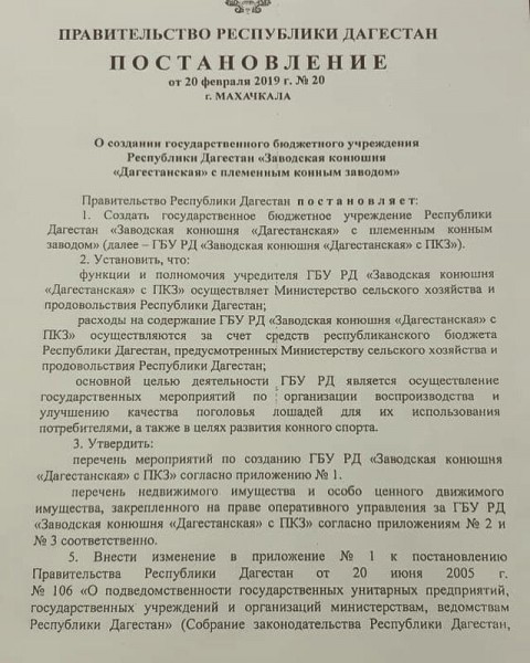 Сегодня, 20 февраля принято решение Правительства Республики Дагестан о создании заводской конюшни «Дагестанская» с племенным конным заводом. После ликвидации в 2016 году государственной конюшни все имущество конюшни было передано на ответственное хранение ООО «Койсу». При этом в последнее время ООО «Койсу» не справлялось с содержанием лошадей, что привело к их истощению. По инициативе Минсельхоза Дагестана и Минимущества Дагестана было поддержано решение о возрождении государственной конюшни с финансированием из республиканского бюджета. Совместная комиссия провела работу по приёмке лошадей и оценку их состояния для принятия срочных мер по их реабилитации. В работу комиссии были включены специалисты по коневодству, работники ветеринарной службы, общественники. Следует отметить, что в последнее время содержание лошадей было организовано Минсельхозом Дагестана при содействии ГУП «Теречное».