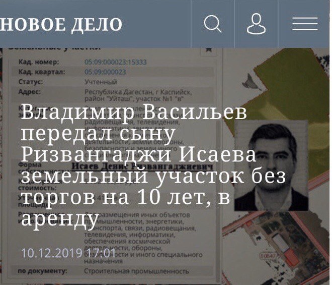 В статье Р. Кадиева «Владимир Васильев передал сыну Ризвангаджи Исаева земельный участок без торгов на 10 лет, в аренду», размещённой 10 декабря 2019 года на сайте еженедельника «Новое дело», содержится информация, требующая уточнения.