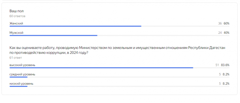 Уважаемые граждане, Минимущество Дагестана проводит ежегодный онлайн - опрос граждан на тему "Как Вы оцениваете работу по противодействию коррупции, проводимую в Министерстве по земельным отношениям Республики Дагестан ?"